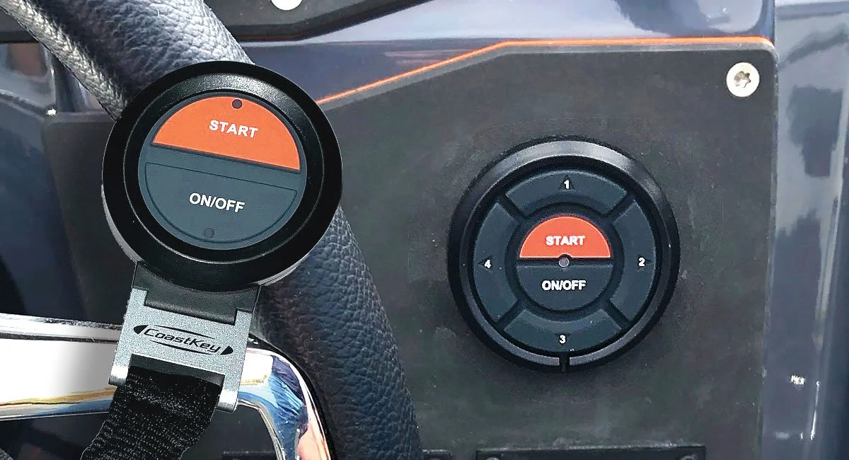 COASTKEY STANDART & COASTKEY PREMIUM seçeneklerini tercih ettiğinizde, sistem kablosuz bir uzaktan kumanda (FOB) ile genişletilir ve böylece tam kablosuz bir başlatma/durdurma sistemi haline gelir, ayrıca kablosuz acil durdurma fonksiyonuna sahip olur. Bu, kaptana hareket özgürlüğü ve güvenlik sağlar; kaptan denize düşerse motor otomatik olarak durur.